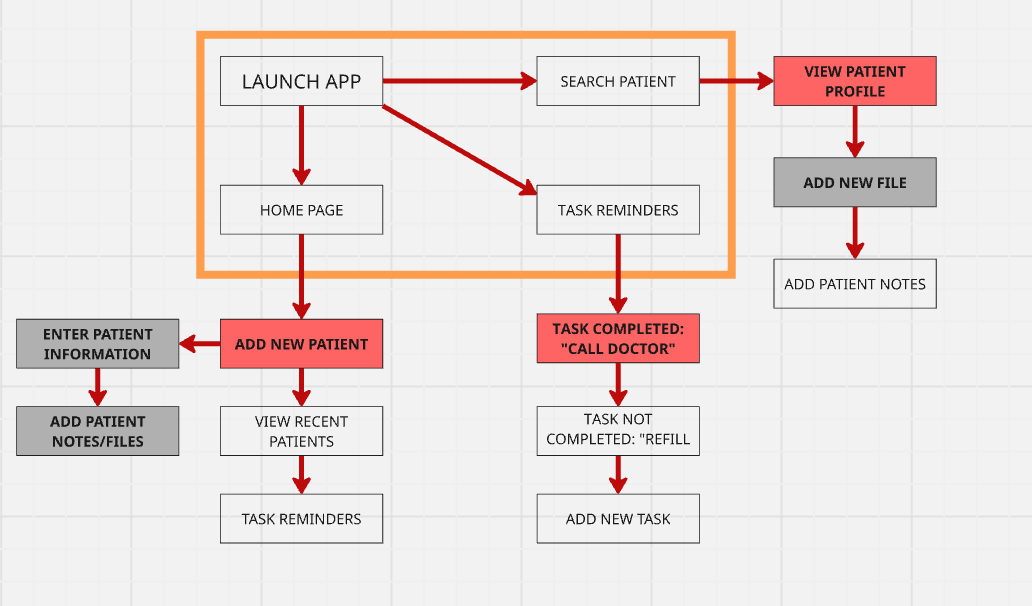 We constructed a user flow to map out how healthcare professionals interact with the DocuCare app, starting from launching the app to completing tasks such as uploading patient notes or referring a patient. This journey allows us to identify key interaction points and ensure smooth navigation through both primary and secondary user goals.