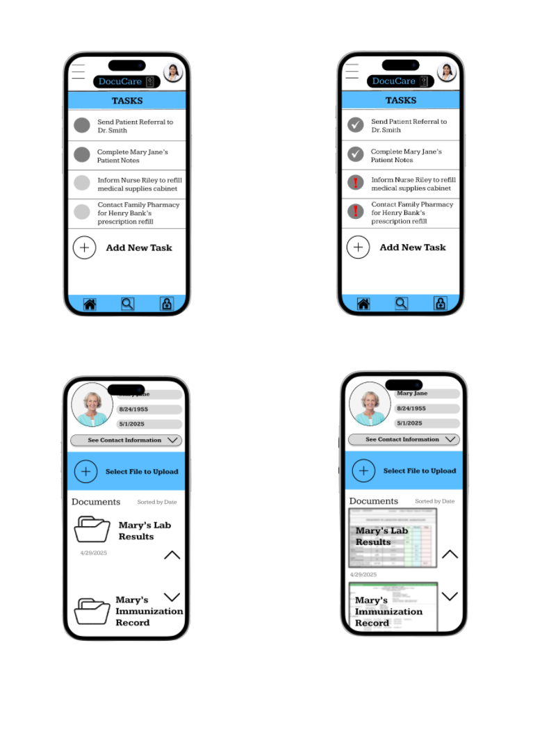 After completing the low-fidelity wireframes, we transitioned into building out the high-fidelity prototype of DocuCare. To ensure the design met user needs, I developed a usability test and ran it alongside a 12-question feedback form to capture thoughts and reactions from participants. A total of 8 users tested our clickable prototype, running through common healthcare documentation tasks like adding a patient, uploading files, and completing task lists. The insights we gathered were instrumental in shaping our final iterations.